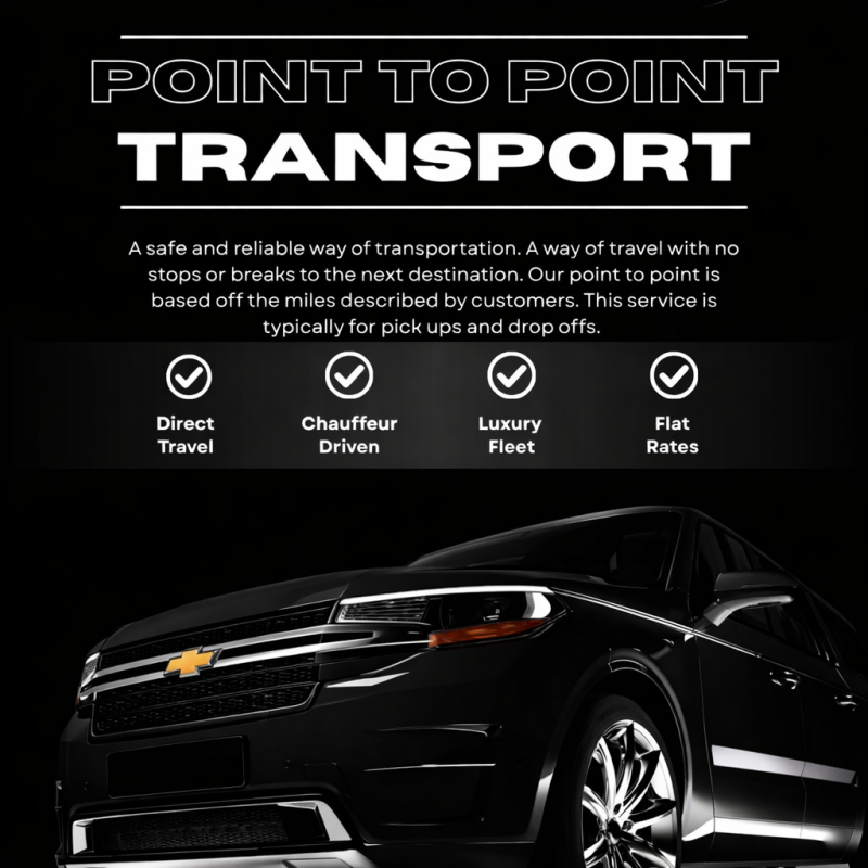 At our company, we specialize in point-to-point transportation services designed for those who need to get from one destination to another quickly and efficiently. Unlike rideshare services like Uber, our focus is on providing a seamless, uninterrupted travel experience. This means no stops and no breaks along the way, ensuring that you reach your destination without delay. Whether you're headed to the airport, a business meeting, or any other important location, our dedicated service guarantees a direct route for your convenience. Trust us to get you where you need to go, hassle free.